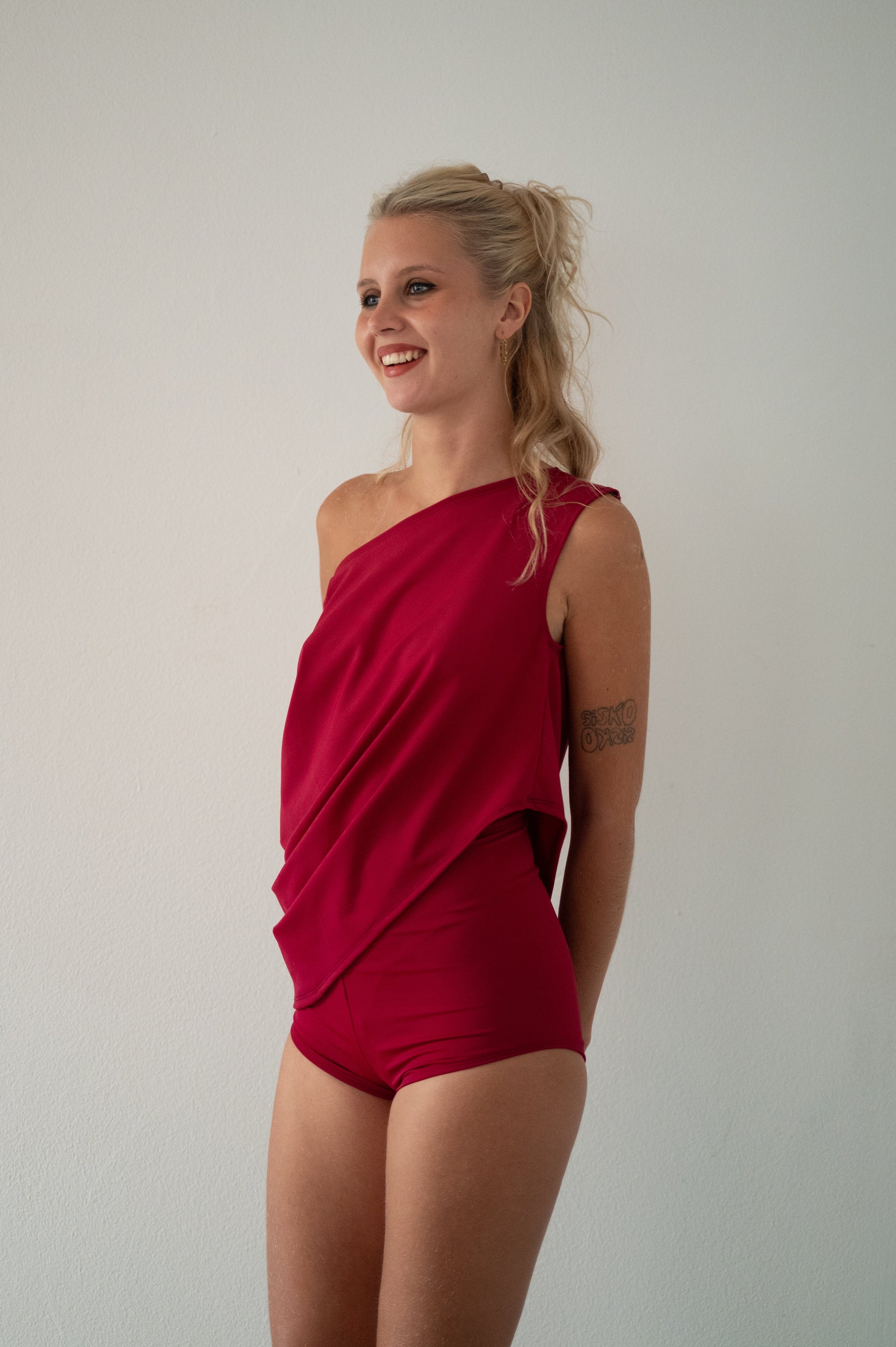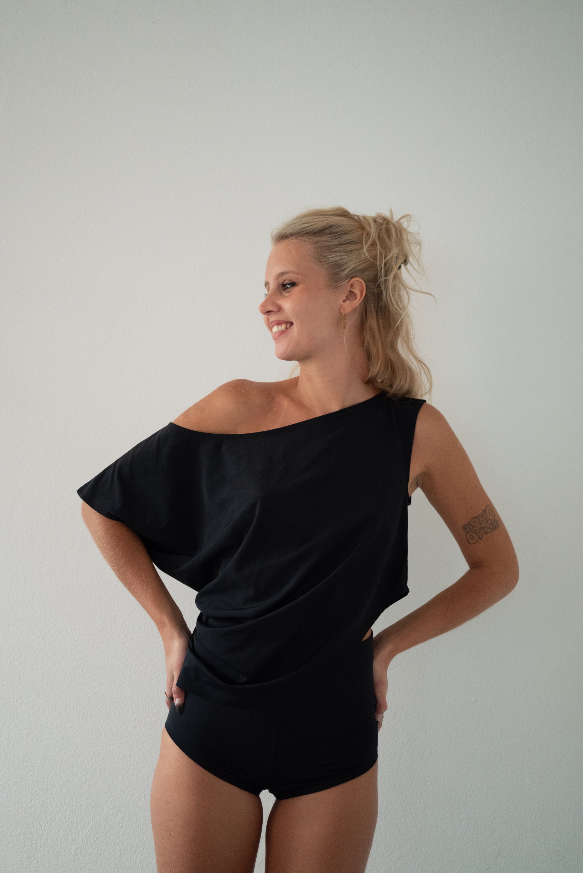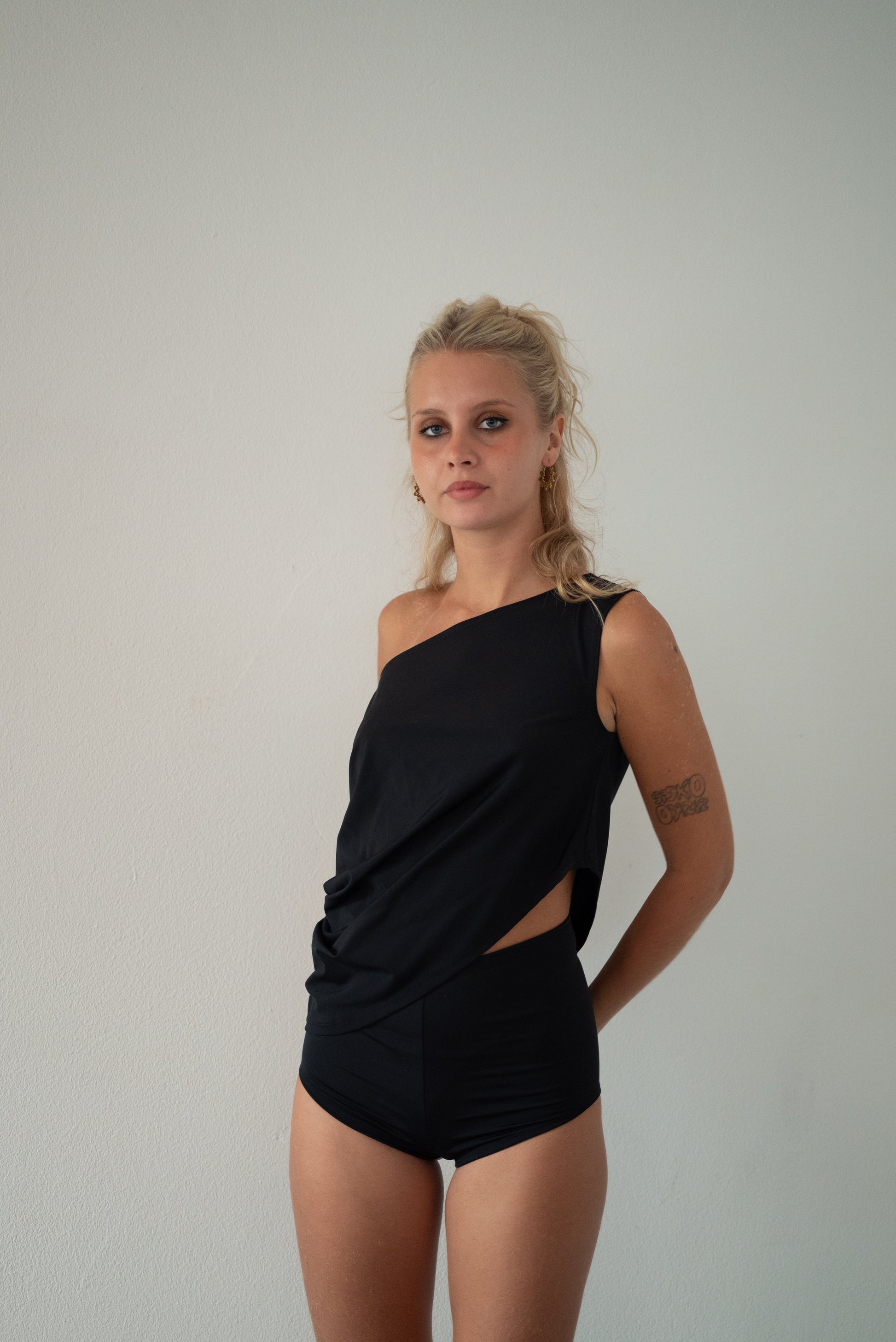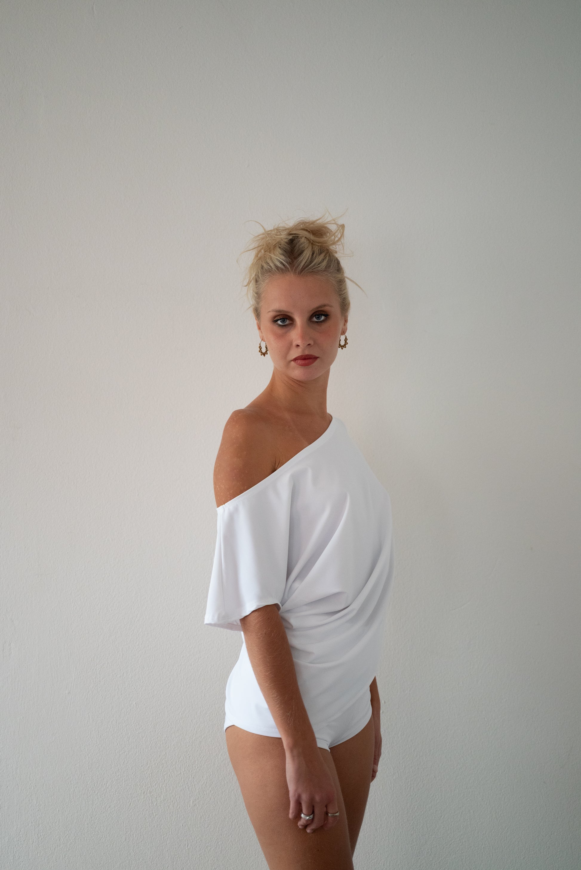 The top is effortlessly cool, an off-one-shoulder silhouette with a loose, flowing fit, made from a single piece of fabric for seamless drape and relaxed movement. Light, breezy, and designed for laid-back summer moments.